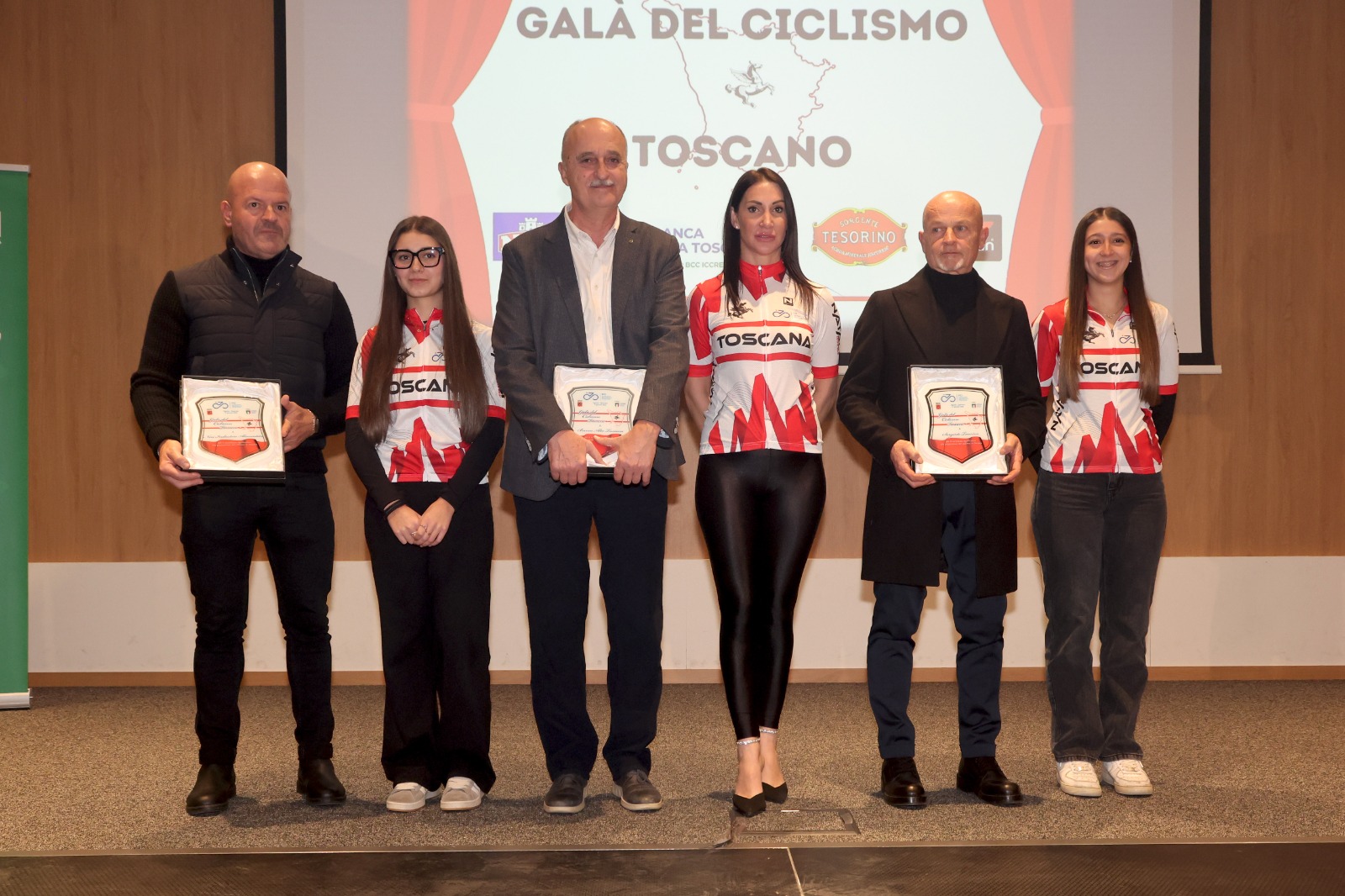 Una straordinaria festa per il Galà del ciclismo toscano nel mega Forum della Banca Alta Toscana a Vignole di Quarrata in provincia di Pistoia, elegante, spazioso e scintillante di luci e colori. Era gremito quando la cerimonia ha avuto inizio tra applausi, filmati, slide con i saluti istituzionali del sindaco di Quarrata Gabriele Romiti, del presidente della Banca Alta Toscana Alberto Banci, di Bernard Dika sottosegretario della Regione Toscana, di Saverio Metti vice presidente della Federazione Ciclistica Italiana, del presidente regionale del CONI Simone Cardullo, e il saluto di Luca Menichetti presidente del Comitato Regionale Toscana che assieme a un gruppo di collaboratori merita il più vivo plauso per l’organizzazione della cerimonia. In avvio il saluto tramite video di Elia Viviani team manager della Nazionale Azzurra e la presentazione della nuova maglia della rappresentativa della Toscana con i premi per Alessio Baronti (Neri Sottoli), Alberto Banci (Banca Alta Toscana) e Ivano Mansani (ex corridore) per l’Acqua Tesorino.