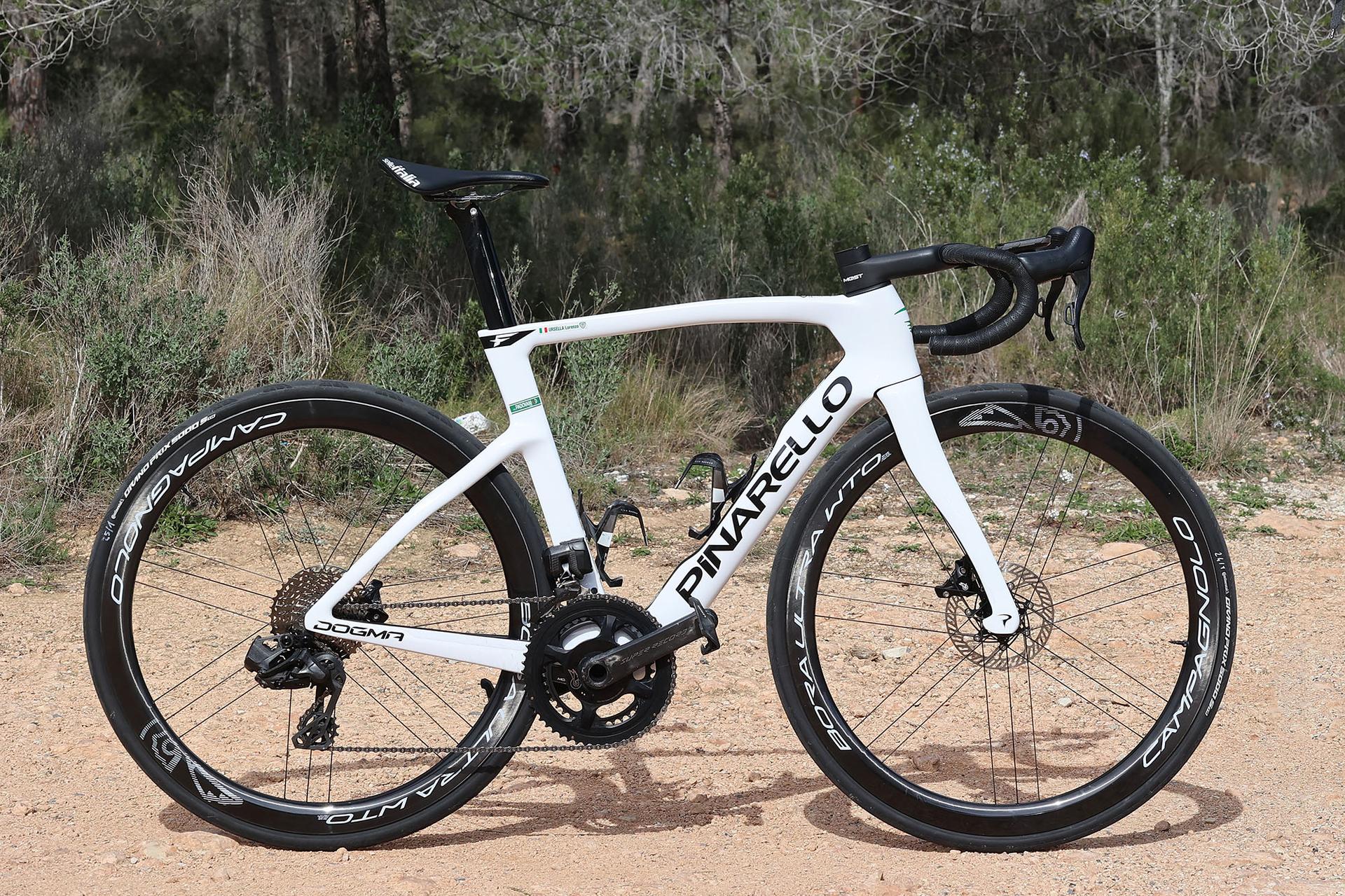La Pinarello Dogma F realizzata con colorazione bianco-nera riporta alcune personalizzazioni di colore verde; la medesima tinta caratterizza anche le Pinarello Bolide F TT da cronometro.